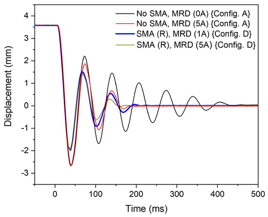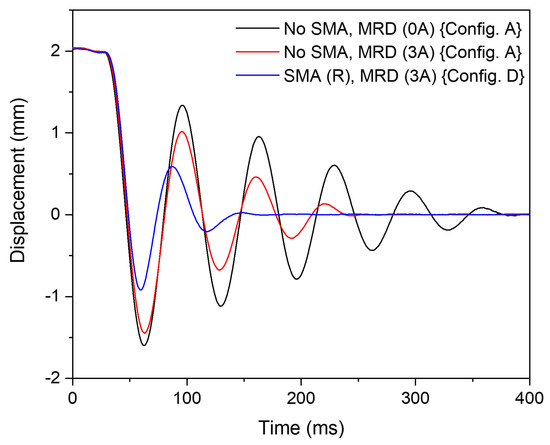 The displacement behaviour versus time demonstrating the effect of hybrid SMA-MR damper (‘Config. D’) and MR damper (‘Config. A’) for a loading of 2 mm.