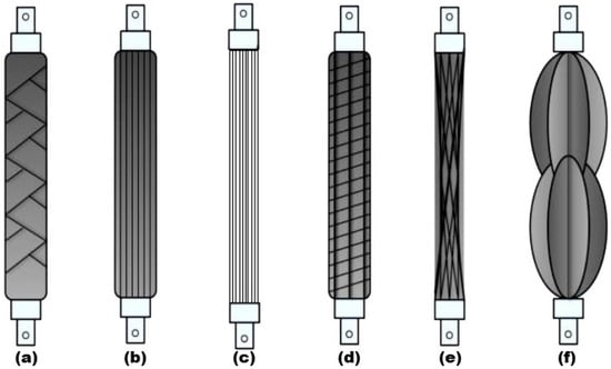 Types of conventional PAMs [6]:(a) McKibben Muscle/Braided Muscle; (b) Pleated Muscle; (c) PAM reinforced by Kevlar Fiber; (d) Yarlott Netted Muscle; (e) Paynter Hyperboloid Muscle; (f) ROMAC Muscle.