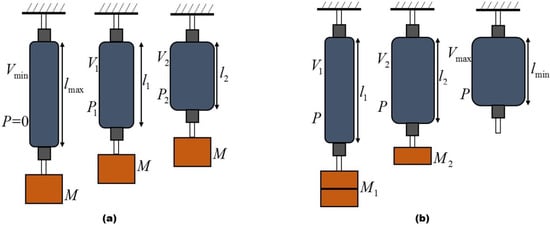 The basic operations of the PAM can be considered with two examples: (1) under a constant load and with varying gauge pressure, and (2) with a constant gauge pressure and a varying load. Figure 2a, for the first operation, shows a PAM that is fixed at one end with a constant mass (M) hanging from the other side. The pressure difference across the membrane, i.e., its gauge pressure, can be increased from an initial value of zero. At zero gauge pressure, the volume of the membrane is considered to be minimum and its length maximum . Now, the actuator is pressurized to a gauge pressure , which makes the muscle bulge and, at the same time, it develops a pulling force. This force will lift the mass (M) until the equilibrium point where the generated force will equal to the mass weight . In this condition, the volume of the PAM is increased to and its length is contracted to . Further increasing the pressure to , this process will continue until it reaches the maximum allowable gauge pressure . From this kind of operation of the PAM, two basic actuator behavior rules can be noticed, where a PAM shortens by increasing its enclosed volume and it will contract against a constant load if the pneumatic pressure is increased.