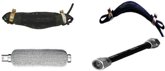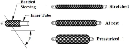 The McKibben muscle, as shown in Figure 4, was derived from a patented design by Morin [25], who embedded the fibers into a rubber diaphragm. According to Baldwin [29], it was first introduced by the physician, Joseph L. McKibben, in the 1950s to actuate an orthotic device for polio patients due to the similarity in length–load curves between this artificial muscle and skeletal muscle [30,31]. The general behavior of these muscles with regard to shape, contraction, and tension when inflated will depend on the geometry of the bladder and surrounded braid at unpressurized condition along with the materials used. Usually, these braided muscles have a cylindrical shape because of a cylindrical bladder and a constant pitch angle throughout the braid. The sleeved bladder muscles, patent by Beullens [28], are different from the McKibben type in the design of the inner bladder, where it is not connected to the sleeve, which means that there is no passive spring force is added to muscle tension. The main advantage of this type of PAM is its extreme ease of assembly.