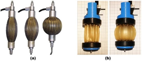 Pleated muscle actuator was developed by Daerden and Lefeber [32,33], which is shown in Figure 5a. There is no material strain and friction involved in this type of muscle when it is inflated. This is due to the muscle membrane, which consists of the number of pleats in the axial direction and inflates by unfolding the pleats. Furthermore, membrane stresses in the parallel direction (perpendicular to the axis) are kept negligibly small and decrease with increasing the number of folds. Basically, there is no required external energy to inflate the membrane and, due to the absence of friction, no hysteresis is observed. The characteristics of this type of muscle depend on the ratio of full length to minimum diameter, strain behavior of the membrane’s material, contraction rate, and applied pressure. A modified version of the pleated muscle actuator by Terryn et al. [34] is shown in Figure 5b, where the membrane is constructed out of a self-healing polymer.