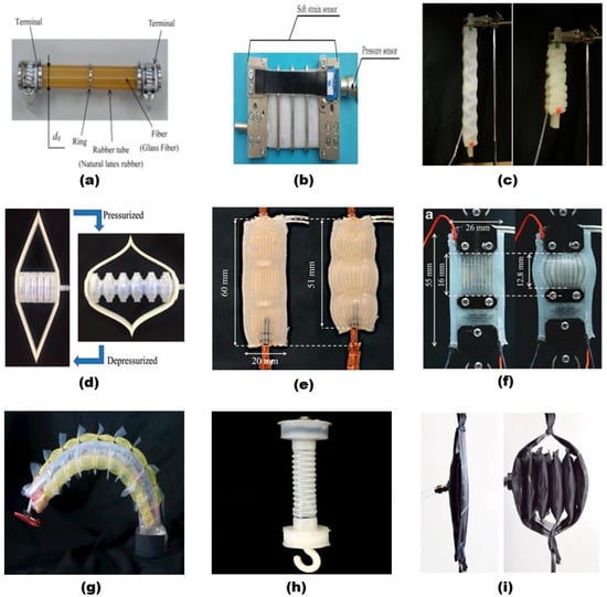 Advanced PAMs: (a) Glass fibers reinforced PAM [38]; (b) Peano muscle [41]; (c) SRM [42]; (d) sPAM [37]; (e) FPAM [43]; (f) sFPAM [44]; (g) HCRPAM [45]; (h) rPAM [46]; (i) High-displacement PAM [47].