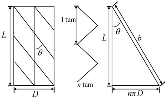 There are two geometric models of PAM, which are the most common and widely used, namely, the Chou and Hannaford model [2] and the Tondu and Lopez model [3]. The Chou and Hannaford model [2] is the simplest geometrical model for a static performance of the PAM. With this approach, the PAM has been modeled as a cylinder, as shown in Figure 9, with a length L, thread length b, diameter D, and number of thread turns n. The angle is defined as the angle of the threads with the longitudinal axis. Utilizing the energy conservation principle, the simple geometric force of PAM is calculated as follows, multiplying the gauge pressure P with the change in volume with respect to length [50].