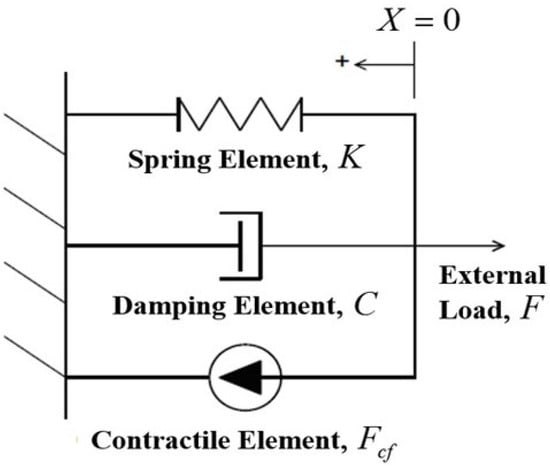 There is a method of PAM modeling which is popularly known as biomimetic or biomechanical model due to similarities with the biological muscle and try to model in the literature [27]. Basically, PAM is a composite of a rubber mold with embedded structural fibers, which creates a force in the longitudinal direction extending the circumferential direction in pressurized condition. A phenomenological approach is considered by Serres et al. [54,55] to understand the dynamics of PAMs by modeling it with three elements: a spring element, a damping element, and a contractile element in parallel, as shown in Figure 10.