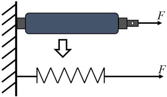 PAM with different lengths and diameters can be modeled with the help of simplified empirical models. In this approach, The stretched length is zero when the air pressure inside PAM only the atmospheric pressure, and this length increases when the air pressure also increases [56]. The natural mechanical operation of the PAM and the mechanical spring exhibit similar behavior when a tensile force is being applied to them, as shown in Figure 11. Usually, the stiffness of the spring is fixed and depends on the material properties and geometry of the spring, whereas the stiffness of PAM is variable and also depends on the above properties in addition to the air pressure inside the muscle.