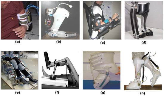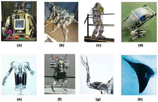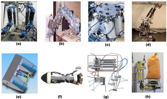 Biorobotic applications of PAMs: (a) ISAC [124]; (b) Ajax [129]; (c) Lucy [130]; (d) Mowgli [132]; (e) Zwei–Arm–Roboter [135]; (f) Pneumatic Athlete Robot [136]; (g) Airic’s robotic arm [105]; (h) Aqua ray robot [105].