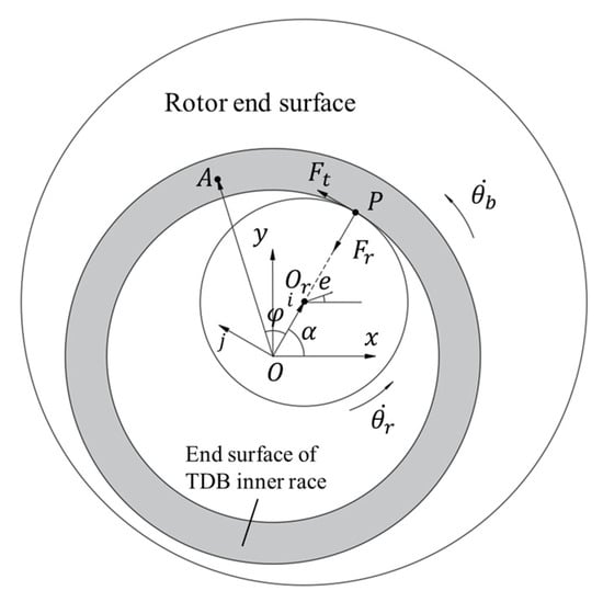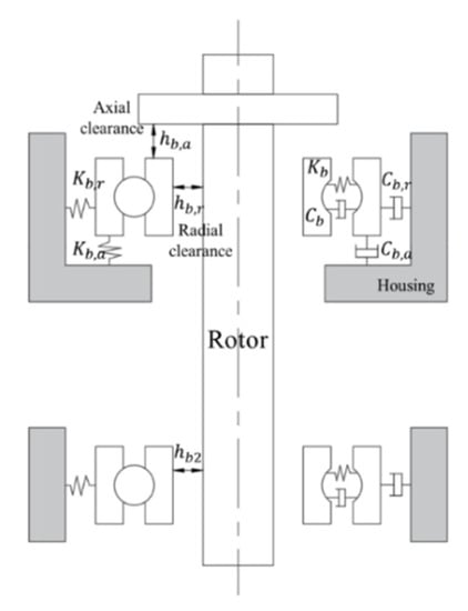 TDBs can be described by some classical models of rolling bearings []. Since it is difficult to design a lubrication system, the TDB is usually in the state of no lubrication or grease lubrication, so the most important thing that needs clarification is the friction torque inside the bearing, which is directly related to the energy loss and temperature rise of the TDB. A high bearing temperature can lead to lubricant deterioration, wear increase, and even bearing damage.