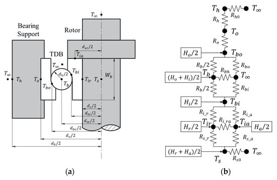 Thermal model of the rotor–TDB system: (a) Temperature node model; (b) Heat transfer grid model.
