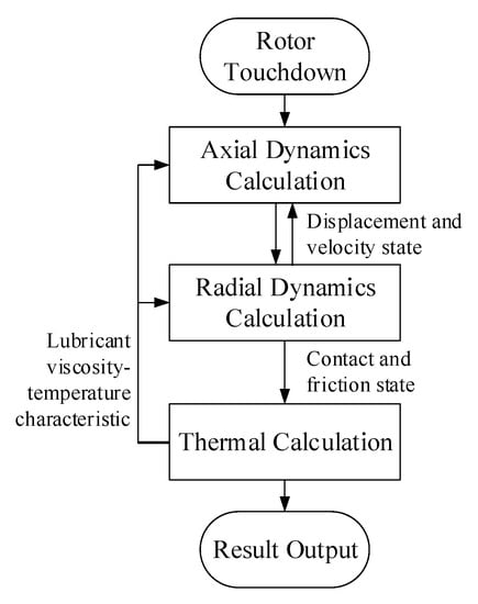 Overall, the calculation process can be summarized by Figure 5. The axial dynamic response, radial dynamic response, and thermal response of the system are calculated in sequence. Among them, the spatial position relationship of the rotor and the TDB causes the axial and radial dynamics to influence each other. The temperature change caused by the dynamics also affects the dynamic response because of the viscosity–temperature characteristics of the lubricant.