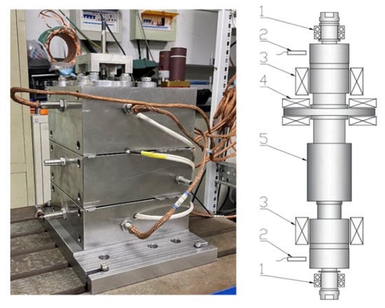 AMB–rotor–TDB drop test bench: 1—TDBs, 2—eddy current sensors, 3—radial AMBs, 4—axial AMB, 5—rotor.