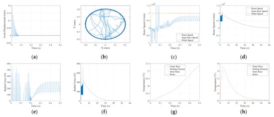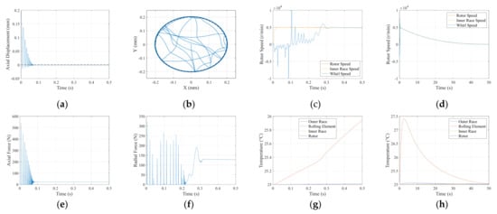Numerical simulation results of the rotor touchdown at 5000 r/min: (a) Axial displacement, (b) Radial trajectory, (c) Rotor speed change in the first 0.5 s, (d) Rotor speed change for the whole process, (e) Radial contact force of the TDB in the first 0.5 s, (f) Radial contact force of the TDB for the whole process, (g) Temperature change in the first 0.5 s, (h) Temperature change for the whole process.
