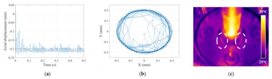 At a 5000 r/min drop in Figure 12, the rotor quickly entered a full-rub whirl state. Compared to the simulation results, the rotor experienced a longer period of backward whirl and entered a forward dry-friction whirl state, then decelerated to zero velocity synchronously as in the simulation. At a 20,000 r/min drop in Figure 13, the rotor moved more quickly from the backward whirl into the forward whirl than at the 5000 r/min drop. Then, the rotor remained at a whirl speed of 6174 r/min, resulting in a dry-friction whip state. After the speed was greatly reduced, the whirl speed also gradually decreased synchronously with the rotor, changing from dry-friction whip to dry-friction whirl. The maximum temperature of the rolling body measured by the thermal imaging camera was 1.5 °C at 5000 r/min and 9.5 °C at 20,000 r/min above the ambient temperature, which were slightly lower than the simulation results, 2.4 °C at 5000 r/min and 10.5 °C at 20,000 r/min.