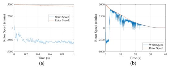 Rotor speed and whirl speed measured in the 5000 r/min drop test: (a) First second, (b) Whole process.