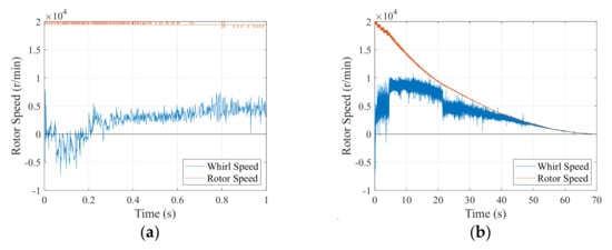 Rotor speed and whirl speed measured in the 20,000 r/min drop test: (a) First second, (b) Whole process.