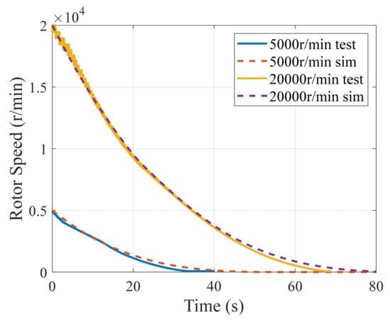 The above conclusions are drawn through the simulation of the dynamic and thermal coupled model. Compared with models in other studies, this model can simulate the whole process of drop and deceleration. A five-degree-of-freedom AMB–rotor–TDB system experimental bench was established, and a series of drop tests were performed. The drop speed was set to 5000 r/min and 20,000 r/min, and the results showed that the model and the experiment were in good agreement when considering the drop trajectory, rotation speed, and temperature rise, especially for the simulation of the rotor deceleration process, which had good repeatability.