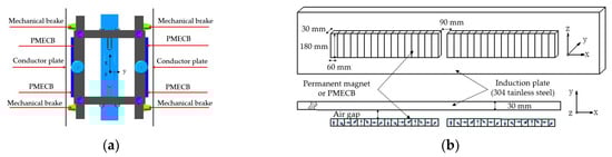 It can be seen from Figure 2a that the bogie is equipped with four sets of PMECBs, which are installed on two sides of the bogie symmetrically. When PMECBs move relative to the metal conductor plates, eddy currents will be induced in the plates and the vehicle will slow down.