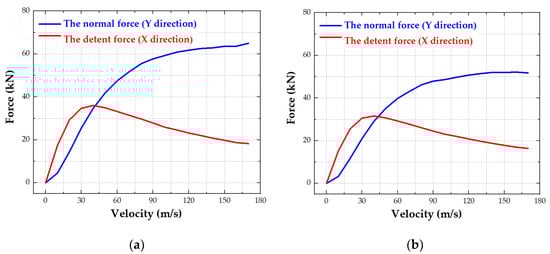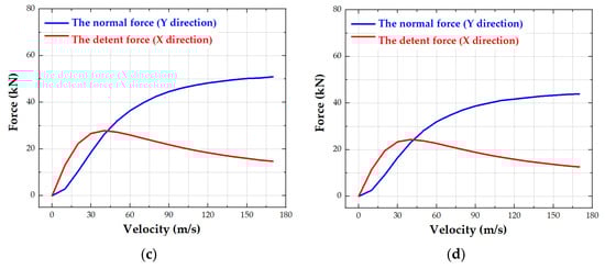 In addition, Figure 3a–d shows that in the low-speed range (about 0–40 m/s), the detent force is large, and the normal force is small. When the speed increases, the normal force is greater than the detent force. In the high-speed range (about 90–170 m/s), the changes in detent force and normal force with speed tend to be gentle, which is conducive to high-speed movement.