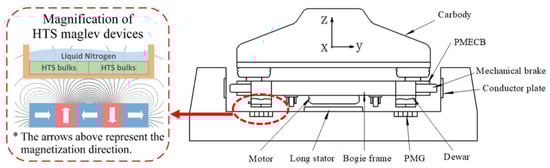 Figure 4 shows the principle and layout of the HTS maglev test vehicle system. The levitation force and the guidance force (together called the flux pinning force) are derived from the interaction between the HTS bulks in maglev Dewars and the permanent magnet guidance (PMG). The driving function is achieved by the long stator coil to pull the on-board mover to realize a high-speed operation. The PMECB is used to realize a braking function in the high-speed case and the mechanical brake is used in the low-speed case.