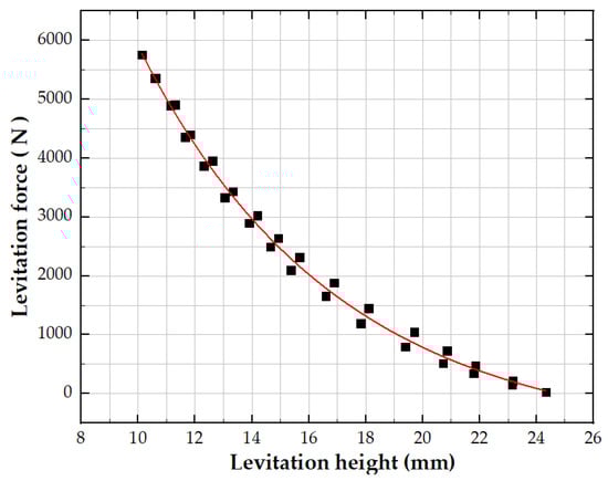 Li and Wang [24,25,26] proposed separately a levitation force model based on an exponential function combining formula deriving and the experimental measurement. These mathematical models describe the relation between the levitation force and levitation height of the single maglev Dewar, but the Dewar here is not primarily used for engineering or as a test vehicle Dewar. The research group to which the author belongs then obtained a new and more accurate levitation force model through the maglev Dewar experiments. Figure 5 shows the relationship between the levitation force and the levitation height of a single Dewar used in the based test vehicle. The mathematical model of the Dewar’s guidance force is represented by the spring-damper module that comes with UM, which is not used in this paper.