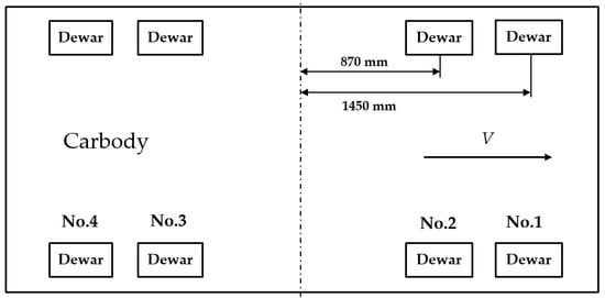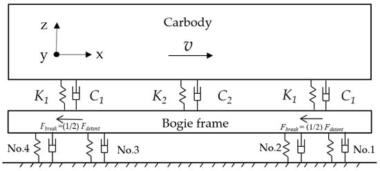 Figure 6 shows the installation location and number of Dewars. Dewars are installed symmetrically, so only Dewar No. 1, No. 2, No. 3, and No. 4 are taken as the objects of study. Figure 7 shows the dynamic model of the HTS maglev test vehicle. The vehicle itself has a primary suspension because of the flux pinning force. The secondary suspension is provided by rubber springs and air springs. The detent force Fdetent in Equation (1) is evenly distributed to two sets of PMECBs, which is done by Fbreak. The main parameters related to the vehicle can be seen in Table 3.