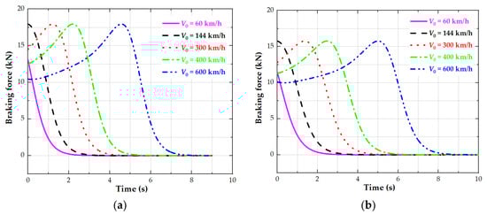 Figure 8a–d show the change process in the braking force (or Fbreak) of a single PMECB at different initial speeds and under different air gaps. At the initial speed of the vehicle V0 = 144 km/h, the braking force of the single PMECB is the largest when PMECBs start working. That is to say, the braking force of the whole vehicle (4 * Fbreak) reaches its maximum value. The braking force then decreases until it is close to zero. At the initial speed of the vehicle V0 > 144 km/h, the braking force of the whole vehicle will first increase and then decrease rapidly after reaching the peak value. At the initial speed of the vehicle V0 < 144 km/h, the braking force of the whole vehicle reaches its maximum at the moment when the PMECBs start working, but it is not the maximum value of the vehicle system. Thereafter, the braking force decreases until it approaches zero. These variations are consistent with the relationship between the detent force and velocity in Figure 3a–d, which proves the accuracy of the vehicle dynamics modeling.