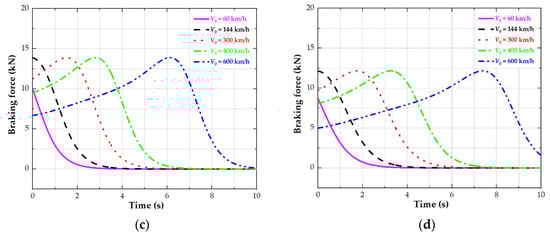 The change process of braking force of single PMECB at initial speeds of V0 = 60 km/h, 144 km/h, 300 km/h, 400 km/h and 600 km/h under different air gaps: (a) under 5 mm air gap, (b) under 10 mm air gap, (c) under 15 mm air gap, (d) under 20 mm air gap.