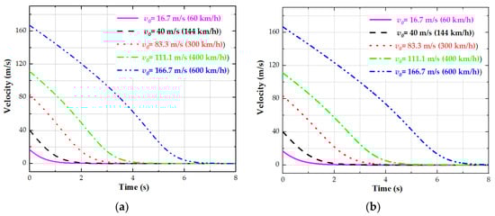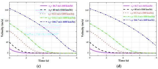 Figure 9a–d shows the change process in the vehicle’s running velocity at different initial speeds, under different air gaps. The larger the initial speed and air gap, the longer it takes the vehicle to come to a standstill. It can be seen from the blue curves that when the vehicle running speed is V0 > 40 m/s (144 km/h), the absolute value of this curve’s slope (representing acceleration) increases; that is, the braking force increases. When V0 < 40 m/s (144 km/h), the absolute value of this curve’s slope decreases gradually; that is, the braking force becomes smaller and smaller. These variations are consistent with the relationship between the detent force and velocity in Figure 3a–d.