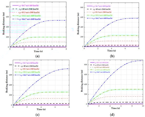 The change process in the braking distance at initial speeds of V0 = 60 km/h, 144 km/h, 300 km/h, 400 km/h and 600 km/h under different air gaps: (a) under 5 mm air gap, (b) under 10 mm air gap, (c) under 15 mm air gap, (d) under 20 mm air gap.