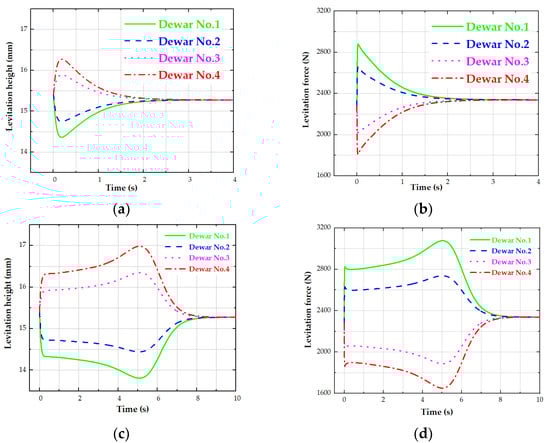 Figure 11c shows that under V0 = 600 km/h and the 10 mm air gap, the actual minimum levitation heights of Dewar No. 1 and No. 2 are about 13.8 mm and 14.5 mm, respectively, and the corresponding levitation forces are about 3080 N and 2750 N (shown in Figure 11d), respectively. Compared with the stable state, the levitation heights of Dewar No. 1 and No. 2 decrease by about 1.5 mm and 0.8 mm, respectively, and the corresponding levitation forces of Dewar No. 1 and No. 2 increase by about 740 N and 590 N, respectively. While the actual maximum levitation heights of Dewar No. 4 and No. 3 increase by about 1.5 mm and 0.8 mm, respectively, and the corresponding levitation forces of Dewar No. 4 and No. 3 decrease by about 740 N and 590 N, respectively. The relevant data above are listed in Table 6.