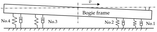 The analysis shows that the detent forces of the PMECBs may not be on the same level as the system centroid. Under the action of the PMECBs, the bogie has a nodding motion, and the nodding angle (β) is shown in Figure 12. As a result, the levitation heights of Dewar No. 1 and No. 2 decreased, while the levitation heights of Dewar No. 3 and No. 4 increased.