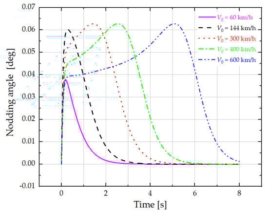 The change process in the nodding angle (β) of the bogie at initial speeds of V0 = 60 km/h, 144 km/h, 300 km/h, 400 km/h and 600 km/h and under 10 mm air gaps.