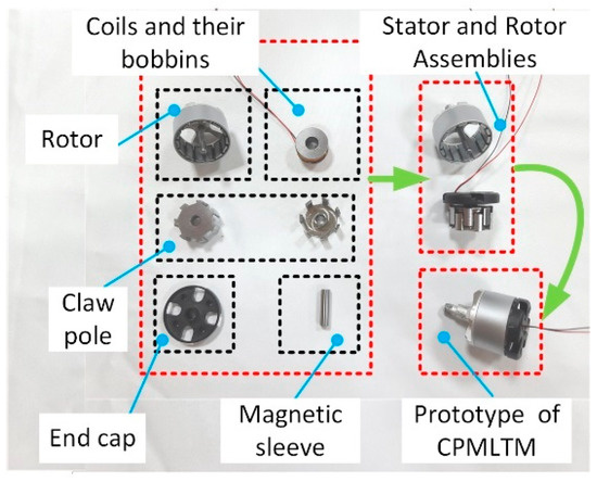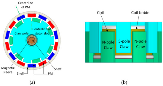 The CPMLTM has degrees of freedom in both axial and circumferential directions, and its structure is shown in Figure 2. The rotor shaft, PM, and shell are the components of the rotor assembly; the claw pole, the magnetic conductive sleeve, the coil, and its bone are the components of the stator assembly. The claw pole includes the upper claw pole with the same structure and the lower claw pole with the teeth facing downward, and the distance between each CPT is equal when the upper and lower claw poles fit together. The cavity formed between the upper claw pole and the lower claw pole is equipped with a coil skeleton wound with coils, and the coil skeleton and the claw pole are fit together by interference. The inner wall of the ring shell is uniformly provided with a plurality of PMs along the circumference, and the magnetic poles of two adjacent PMs are opposite in the radial direction. The PM of CPMLTM is 1 mm longer than the stator claw pole in the axial direction, and the PM always covers the claw pole during the axial movement of the rotor. Therefore, theoretically, the output electromagnetic torque of CPMLTM does not change when the axial relative position of stator and rotor changes. The air gap between the CPT and the PMs is the working air gap, and the radial spacing of the working air gap is always constant.
