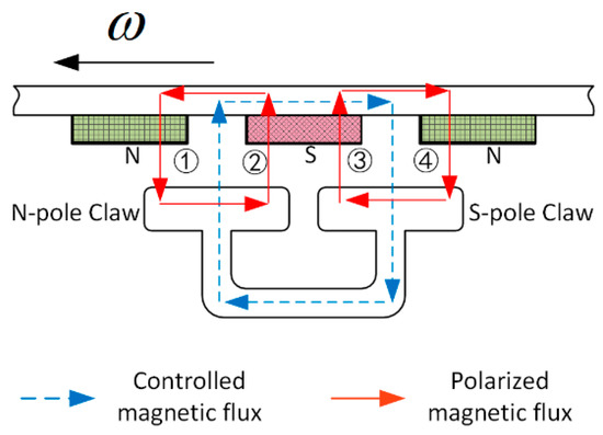 When the coil between the upper and lower claw poles is energized, axial magnetic flux will be generated in the upper and lower claw poles. The upper and lower CPT will be magnetized by the axial magnetic flux into S-pole teeth and N-pole teeth, respectively, as shown in Figure 2b. The axial flux will be converted into radial flux in the CPT, and the converted radial flux will interact with the polarized flux generated by the PM in the working air gap, which results in an increased flux density in one part of the air gap and a decreased flux density in the other part of the air gap, which will cause the rotor to produce angular displacement under the differential action.