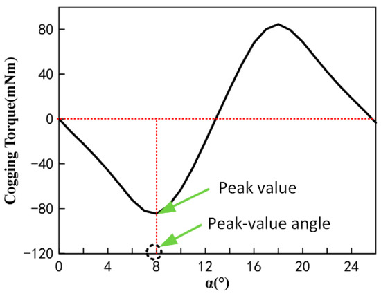 The cogging torque is caused by fluctuations in the tangential component of the force interacting between the PM and the claw pole tooth slot, which always tries to keep the centerline of the PM aligned with the centerline of the CPT or claw pole slot. Figure 6 shows the cogging torque waveform during one cogging torque cycle. This cogging torque waveform plot reveals the existence of three evaluation indicators: peak value, peak-value angle position, and phase. The peak value is the maximum value of the absolute value of the cogging torque that appears in the cogging torque waveform. As the name implies, the peak-value angle position represents the rotor position at the peak of the cogging torque. When the value of the cogging torque is positive in a half cycle, the phase is positive, and vice versa for negative phase.
