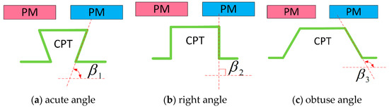 According to the expression of cogging torque, it can be seen that, for CPTs with the same pole arc coefficient and cogging opening coefficient, the difference of their shapes also has an effect on the basic index of cogging torque. Figure 10 gives the CPT shape diagrams of CPT and PM after planar expansion. The β 1 , β 2 , and β 3 in Figure 10a–c are acute, right angle, and obtuse angle, respectively.