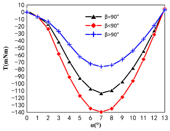 The FEM shows that β is negatively correlated with the cogging torque peak and is in the same phase. Therefore, in the process of designing CPMLTM, the design is to be sharply angled in order to increase the peak slot torque.