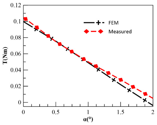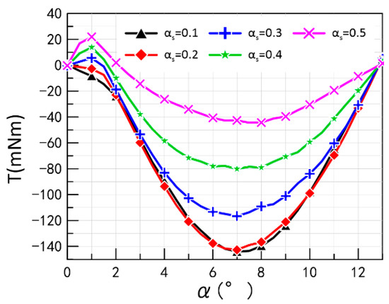 In this study, it is assumed that α is the angle between the centerline of the PM and the centerline of the claw-pole slot, and W is the magnetic co-energy. If saturation is not considered and the permeability of the CPT is assumed to be infinite, the sum of the magnetic field energy in the working air gap and the PM is approximately equal to the energy stored in the magnetic field of the entire torque motor. Therefore, the energy stored in the magnetic field of the torque motor can be expressed as