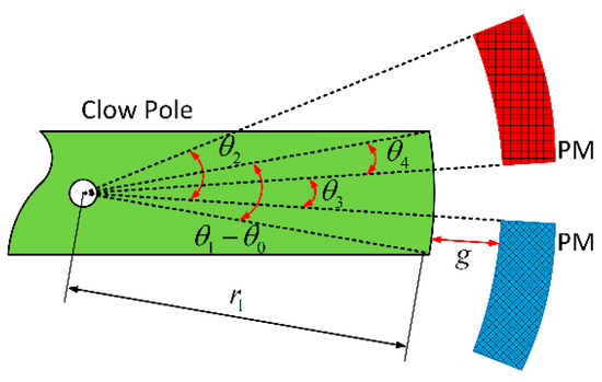 It is assumed that the flux generated by the PM passes through the air gap in the radial direction and then enters the claw pole slot along the circular trajectory, as shown in Figure 9. The effective air gap length within half the claw pole slot distance can be thus expressed as