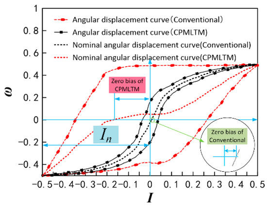 In this study, the counterclockwise direction is defined as the positive direction. A comparison of the CPMLTM and the moving-iron torque motor in Figure 5 shows that the CPMLTM has the same centering and de-energized reset functions as the moving-iron torque motor without the need for additional zero-adjustment screws and zero-adjustment springs. Since the CPMLTM uses magnetic force for centering, its neutral adjustment is more convenient and accurate. Comparing the structure of the two torque motors, we can see that the CPMLTM has a simpler structure and can bring out the advantages of the high power–density ratio of hydraulic components to achieve the ultimate power–density ratio.