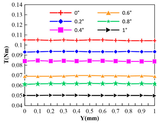 However, the rotor of CPMLTM is automatically suspended in the axial and circumferential neutral positions by magnetic force. In CPMLTM, the height of the PM is greater than the stator, and the stator is automatically suspended in the axial neutral position by the magnetic force of the PM. If the rotor produces an axial displacement away from the axial neutral position, it is subjected to an axial restoration force in the opposite direction of the axial displacement, which brings it back to the axial neutral position. When the coil winding is not energized, the rotor is automatically suspended in the circumferential neutral position under the action of the cogging torque when the centerline of the stator slot overlaps with the centerline of the rotor PM, as shown in Figure 2a. If the rotor produces an angular displacement away from the circumferential neutral position, it will be subjected to a cogging torque in the opposite direction of the angular displacement, which will bring it back to the circumferential neutral position. The relationship between the angular displacement and the torque applied to the CPMLTM is shown in Figure 5.