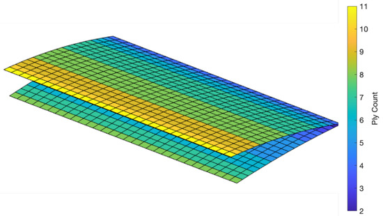 Variable skin stiffness in the form of skin thickness tailoring ensures that the trailing edge skin is sufficiently stiff to support the aerodynamic loads while it is flexible enough to allow for the required deformations. The variable skin thickness is made possible by making use of ply drops of a composite skin. This is needed to obtain a smooth outer surface while matching a prescribed target shape for the control surface. A fluid-structure interaction routine was used to determine the most optimal ply dropping sequence. More details about this procedure can be found in Mkhoyan et al. [25]. The result of the optimisation can be seen in Figure 2 for a single slow morphing module.