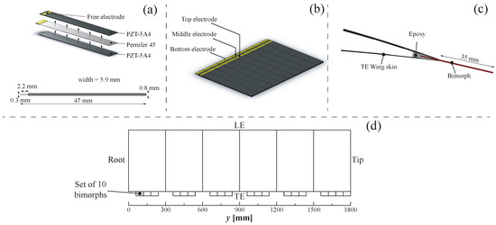 (a) Single piezoelectric bimorph. (b) Set of 10 bimorphs connected in parallel. (c) Cross-section of the trailing edge. (d) Distribution of the 19 sets of 10 bimorphs in the SmartX wing.