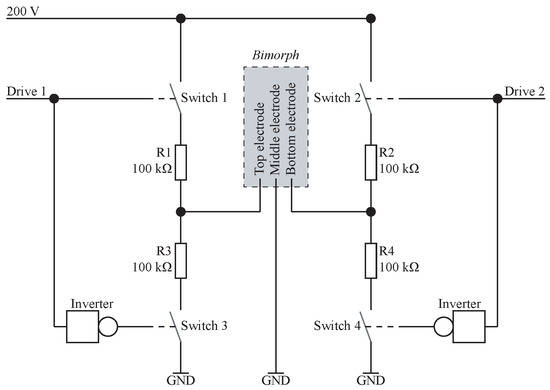 Figure 4 shows the circuit diagram connected to each set of 10 bimorphs. The inputs to the diagram are two drive signals, Drive 1 and Drive 2, and one constant positive 200 supply. The input drive signals are always 0 or 5 powering the switches, which are optical MOSFET switches. The input signals are directly coming from an Arduino controller. By powering Drive1 or Drive2 the bimorphs can be actuated up or down, while by powering none of the two, they are left in the neutral position. If for any reason both Drive1 and Drive2 are powered, they also keep their neutral position. The benefit of this circuit is that only one 200 power supply is required to actuate the bimorphs, while the limitation is that only three settings can be realised: bend down, neutral, and bend up.