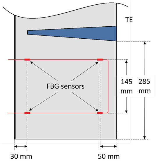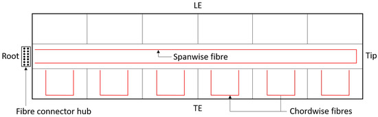 Figure 6 shows the fibre layout and FBG location of one of the morphing modules. All the fibres on the wing are custom (Corning ZBL SMF-28e) single-mode fibres with FC/APC connectors and contain 4 FBG sensors each. The FBGs have high reflectivity (>84%) and bandwidth (>0.85 nm). Each grating is 3 mm long and operates in the C-band wavelength range (1530 nm–1565 nm). These parameters were particularly chosen to conform with the capabilities of the interrogators used.