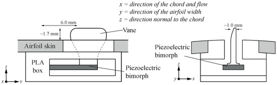 Boundary layer sensors are installed to distinguish between various boundary layer states, which can be used for drag optimisation. Sixteen boundary layer sensors, relying on piezoelectric bimorphs, are embedded in the top skin of the SmartX wing. In this case, the bimorphs have a size of 3 width and 10 length and are operated in the direct piezoelectric mode (i.e., an experienced load results in an electrical signal). Using a 3D printer (Ultimaker 3, Ultimaker B.V., Utrecht, The Netherlands), a polylactic acid (PLA) box was 3D printed to house the piezoelectric bimorph sensors. About 2 of the piezoelectric bimorph length was clamped in one of the walls of this box, leaving a free length of 8 . On the free end of the piezoelectric bimorph, a 3D-printed PLA vane was glued using cyanoacrylate adhesive. This vane later pierced the skin of the airfoil to mechanically couple the boundary layer to the piezoelectric bimorph. The vane reached a height of about above the airfoil skin and had a width of . A schematic representation of the piezoelectric bimorph including the vane inside the box is given in Figure 7. Under these boundary conditions, the natural frequency of the sensor was measured to be about 3 in the direction of the flow.