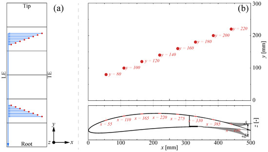 (a) Sensors locations (red circles) and wire paths (blue arrows) installed in the top skin of the SmartX wing. (b) Coordinates of sensors installed within a single section, including upper and lower morphing positions.
