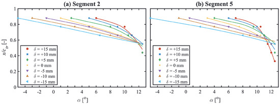 The effect of the SmartX-Alpha morphing flaps on the boundary layer transition point has been investigated experimentally using the technology explained in Section 3.4. The location of the boundary layer transition point is a measure for the wing viscous drag. A dedicated wind tunnel experiment was conceived for that purpose [36]. The chordwise transition point locations are shown in Figure 13. Results are shown for morphing flap number 2, which is located near the root of the wing, and morphing flap number 5, which is located outboard of the wing. The transition point is measured for various angles-of-attack ranging from −4 to 12 and various flap settings ranging from −15 mm (upwards) to 15 mm (downwards) flap trailing edge vertical displacement.