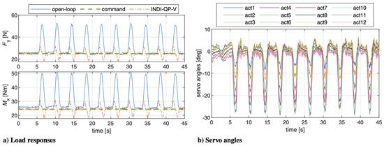 The load alleviation case for 0.5 Hz is shown in Figure 14. The wing root shear force and bending moment results of the 0.5 Hz gust are investigated in open-loop and closed-loop. It is clear from the figure that the open-loop load peaks are reduced in closed-loop. An effect of the control law is that the closed-loop positive load peak is followed by a negative load peak, which is not present in the open-loop case. This poses no problem for the wing structural design as this negative peak does not impose an additional negative load because the wing is trimmed and is already exposed to a finite shear force in the undisturbed case. The actuator response is numbered from inboard to outboard, with act1 being the most inboard actuator. Each of the six morphing flaps has two actuators. The actuator response shows no saturation, and the smoothness of the deformation pattern of the flaps can be observed. This is a consequence of the virtual shape function smoothing of the INDI-QP-V algorithm.