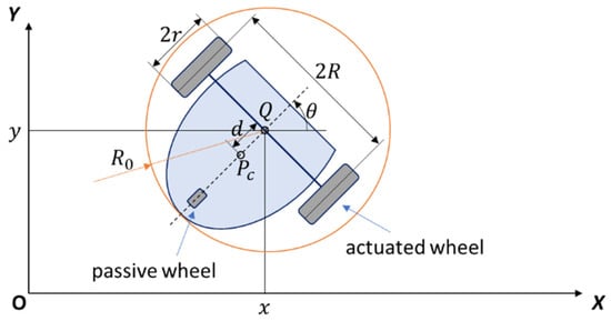 It is assumed that the robot moves on a known and bounded two-dimensional plane, which is discretized into a grid map. Each grid point corresponds to a small area of actual space. If the space in this area is completely passable, its state is regarded as free, otherwise it is regarded as occupied. The structure of wheeled mobile robot with two actuated wheels on left and right sides is shown in Figure 1. Pc is the center of mass of mobile robot. Q is the middle point of two actuated wheels. d is the distance between Pc and Q. R is the half width from left to right actuated wheel. r is the radius of the wheel. Ro is the radius of the smallest circle with its center Q that covers the entire robot. The three variables related to robot coordinates are as follows. θ is the heading angle of mobile robot. x and y are the coordinates of Q. If the wheels are non-slipping, then the nonholonomic constraint is given as: