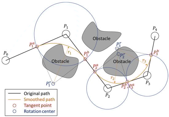 The purpose of path smoothing is to find an arc to replace the path around the path points so that the continuity of the orientation is obtained. Figure 2 shows an example of path smoothing on a five-point path. In this example, we have three arcs to replace part of the original path. For each point of path except the first and the last, its rotation radius, rotation center, and two tangent points are represented as ri, , , and , respectively. The relations between these points are given in (18).